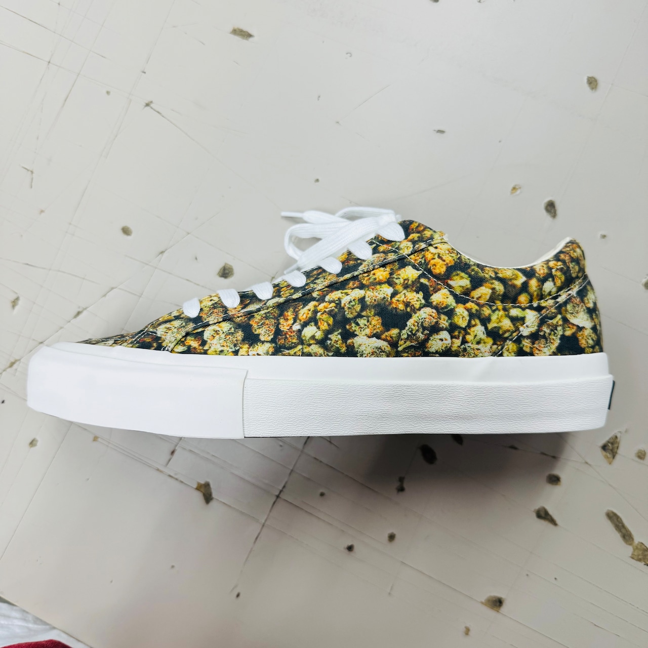 BUDS柄のキャンバス生地から作成し、インソールは強化高反発、インソールのかかと部分も強化、にて履き心地よく疲れないスニーカーを目指してタフな作りにしました。インソールのプリントはシルクスクリーンで一点一点手作業でプリントが消えにくい処理を施しています。