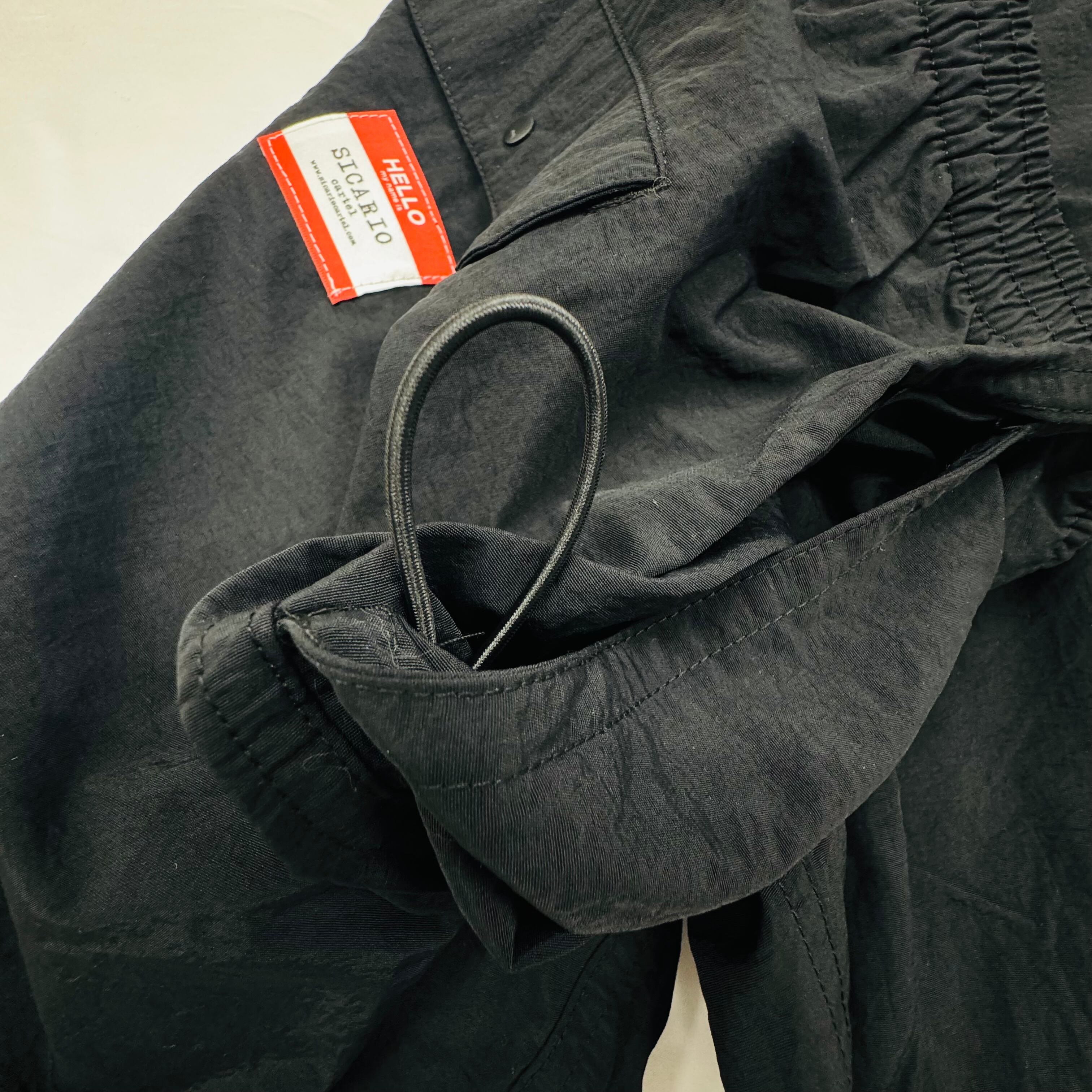 撥水加工を施したナイロン100%生地を使用。右ポケット内側にゴム紐付き。