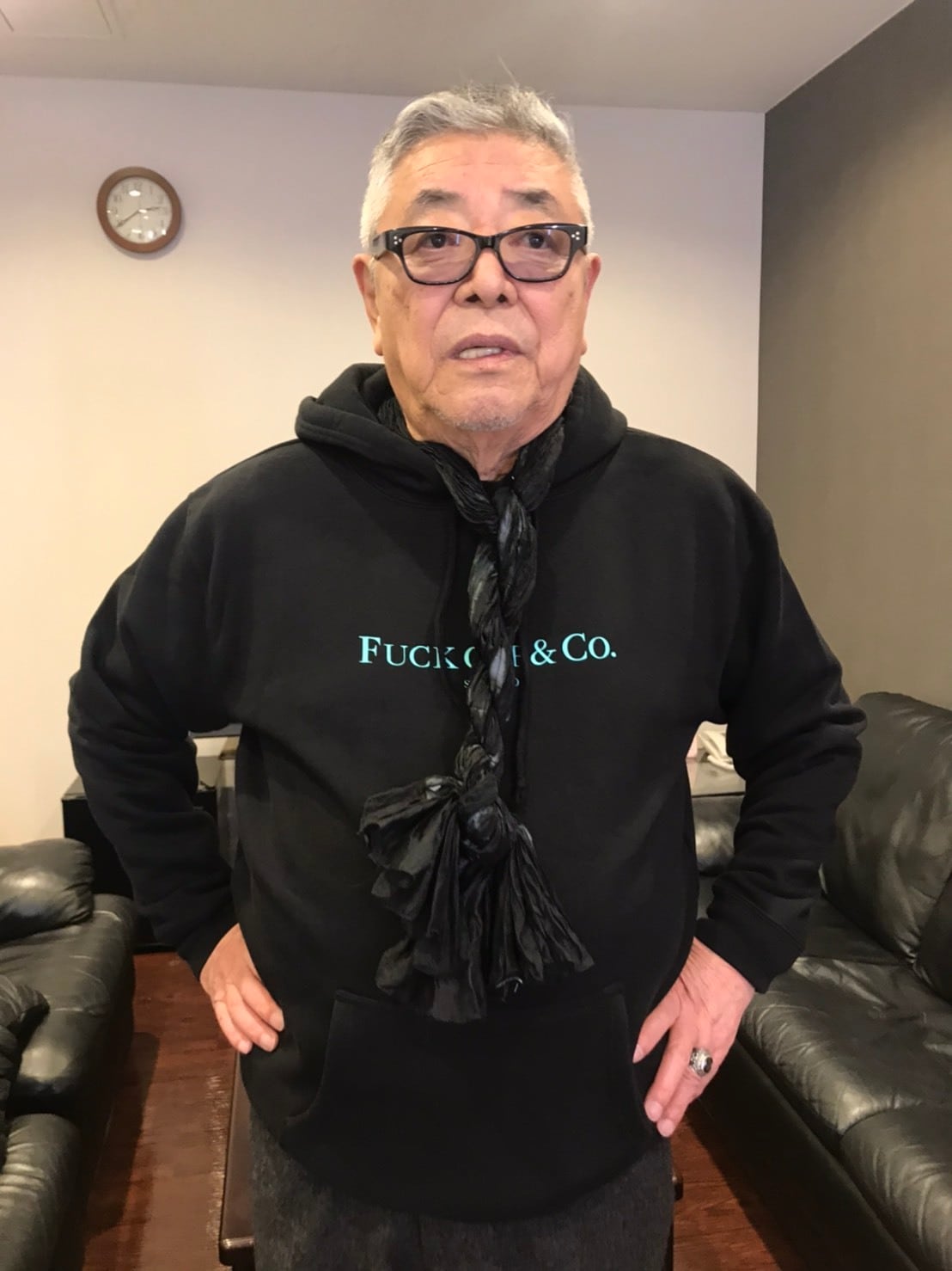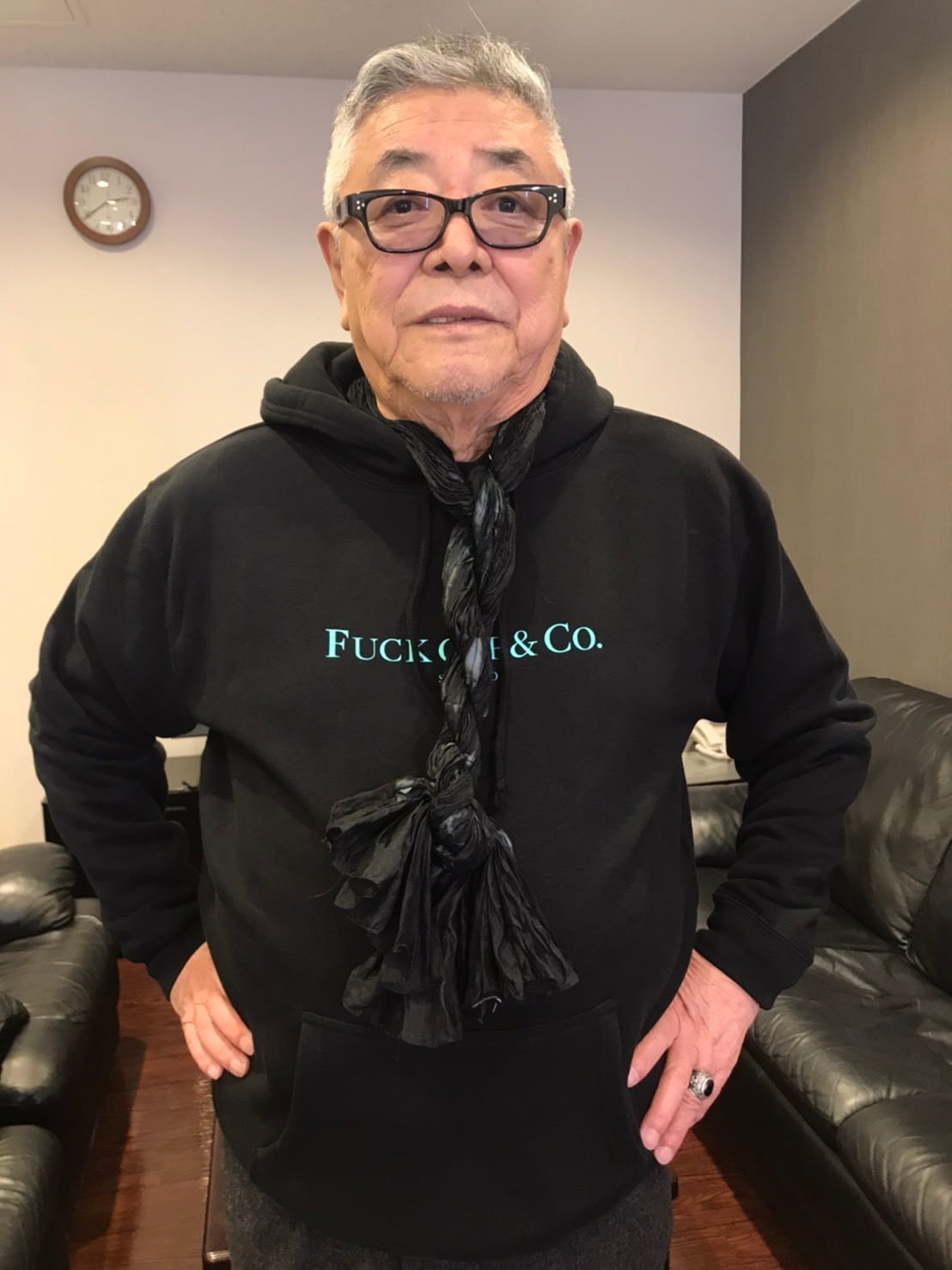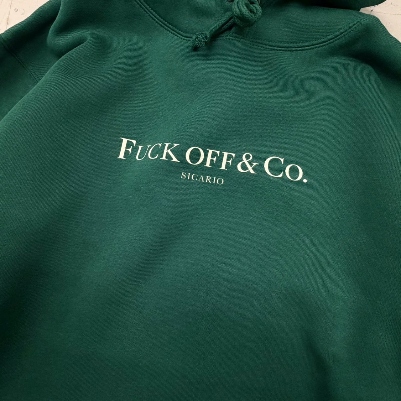 メリハリのあるキリリとした印象を与える10オンスの肉厚でボリュームのあるアイビーグリーンボディに対しフロント前面に「FUCKOFF&CO」がベージュのカラーでプリントされています。