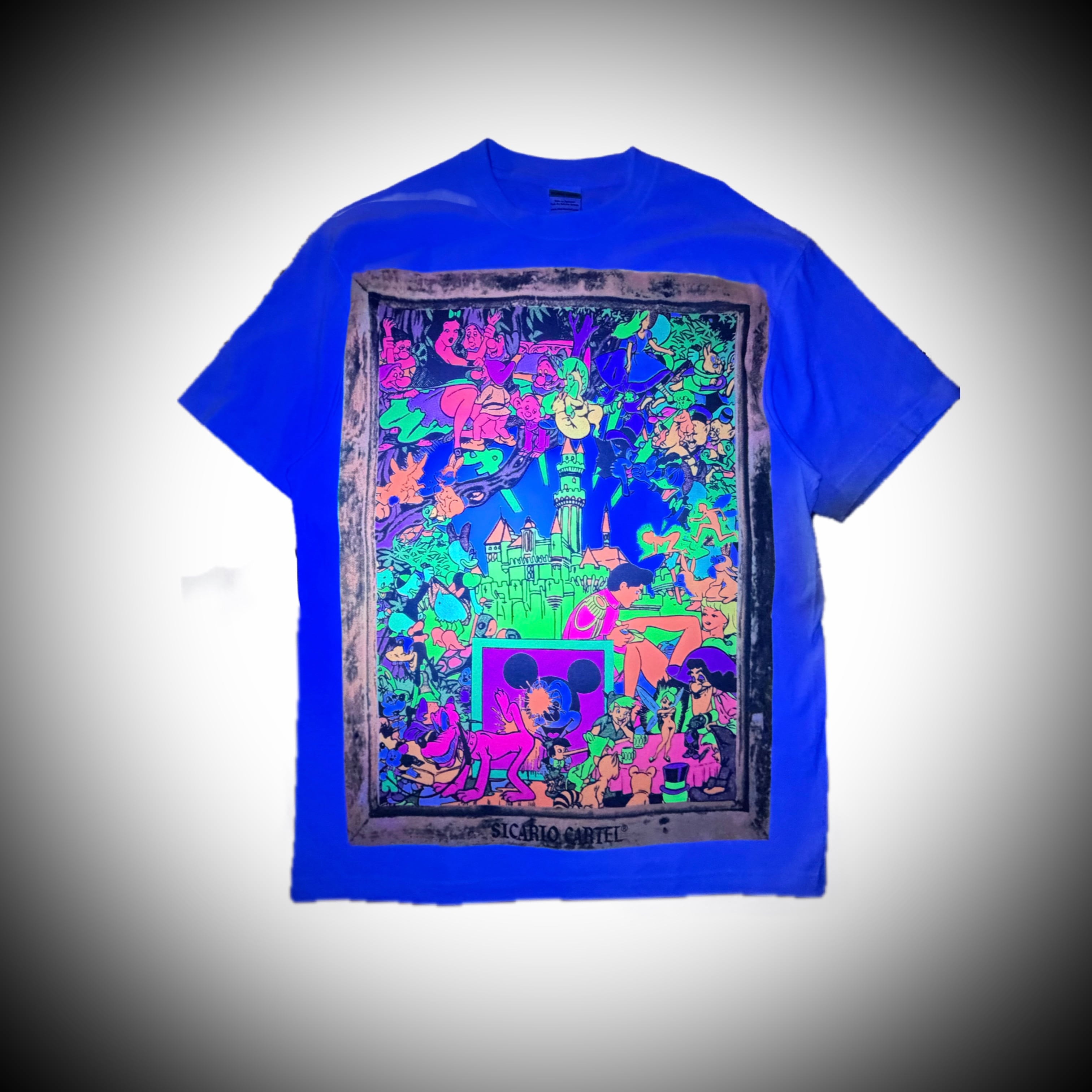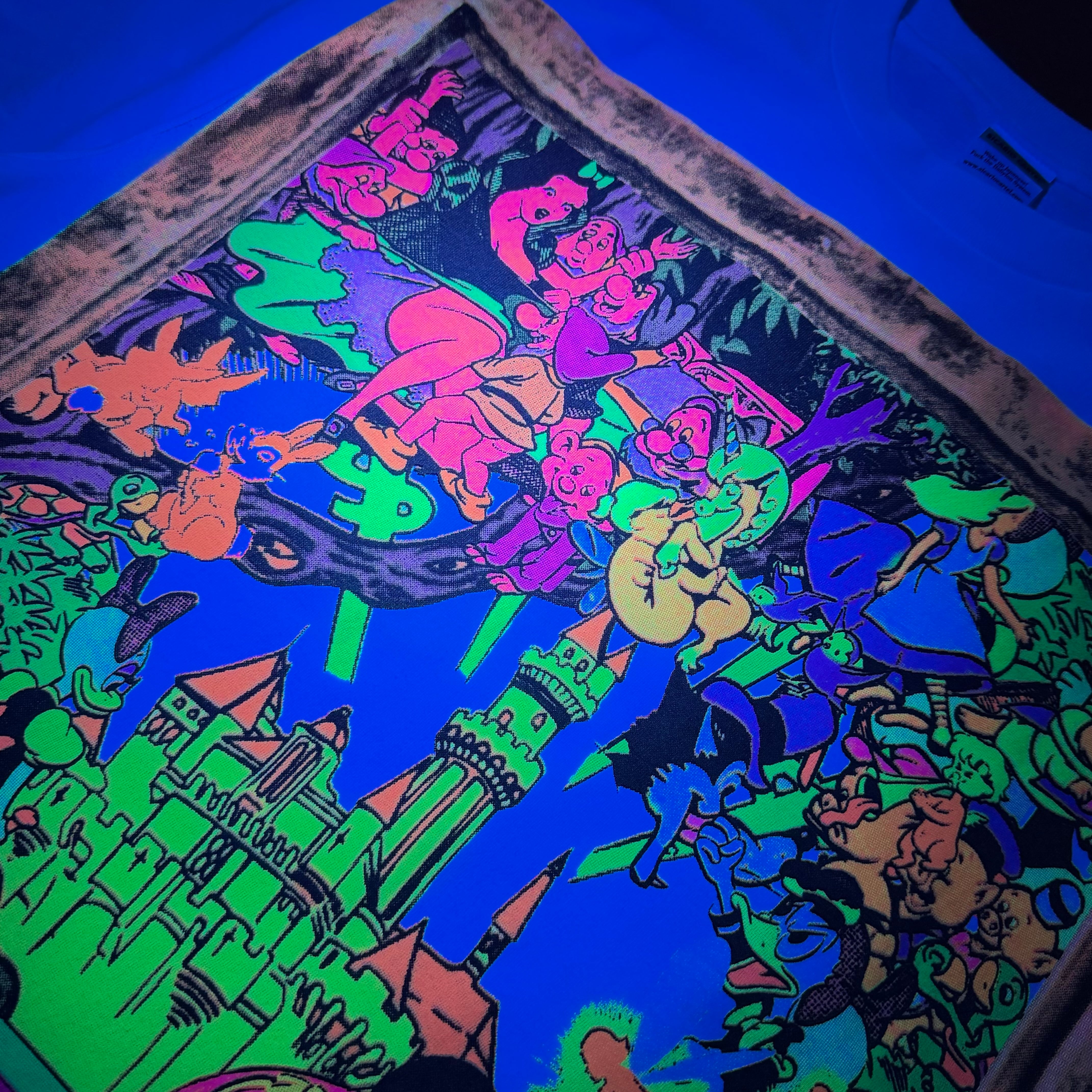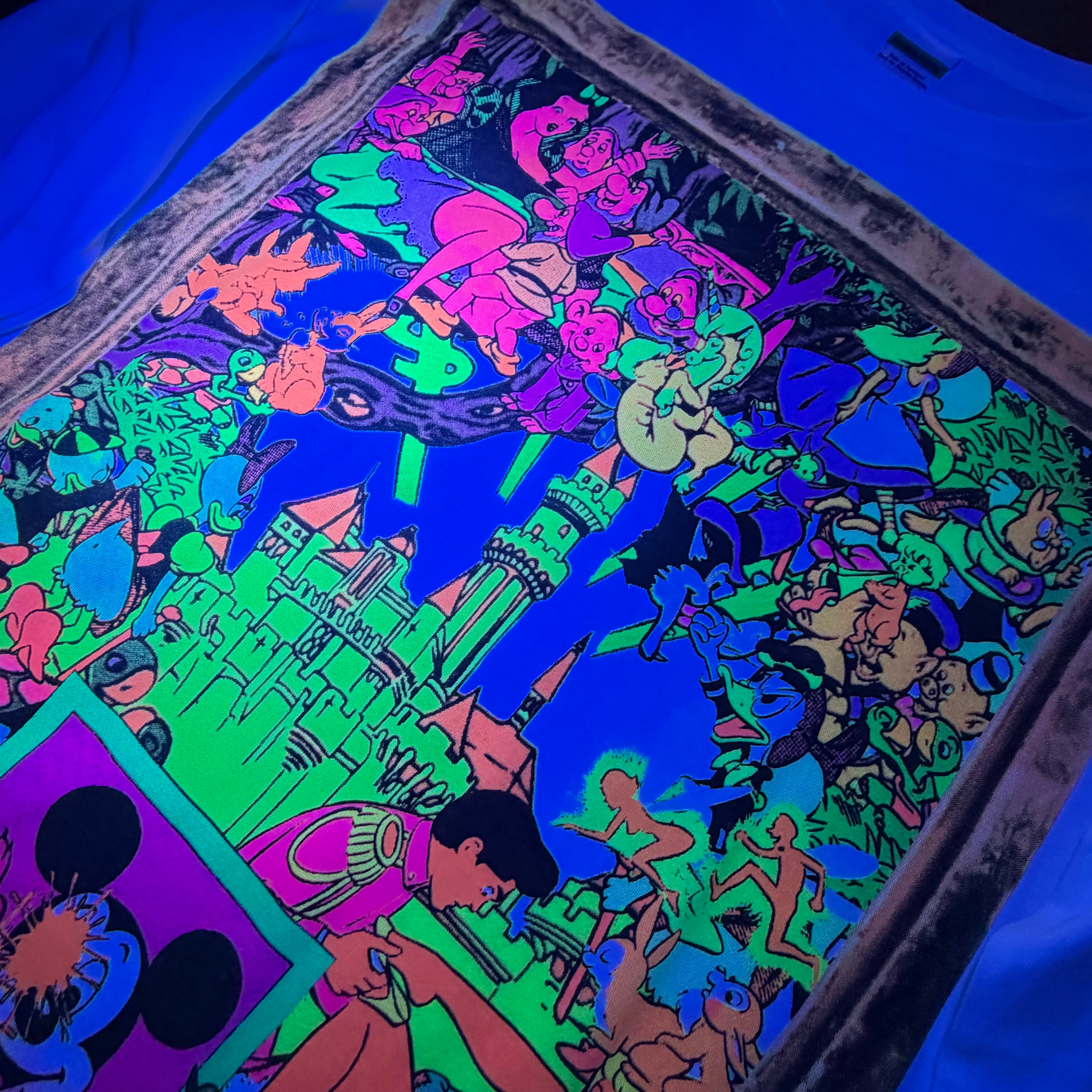 ブラックライトに反応する鮮烈なネオンカラーと退廃的なトーンのコントラスト。