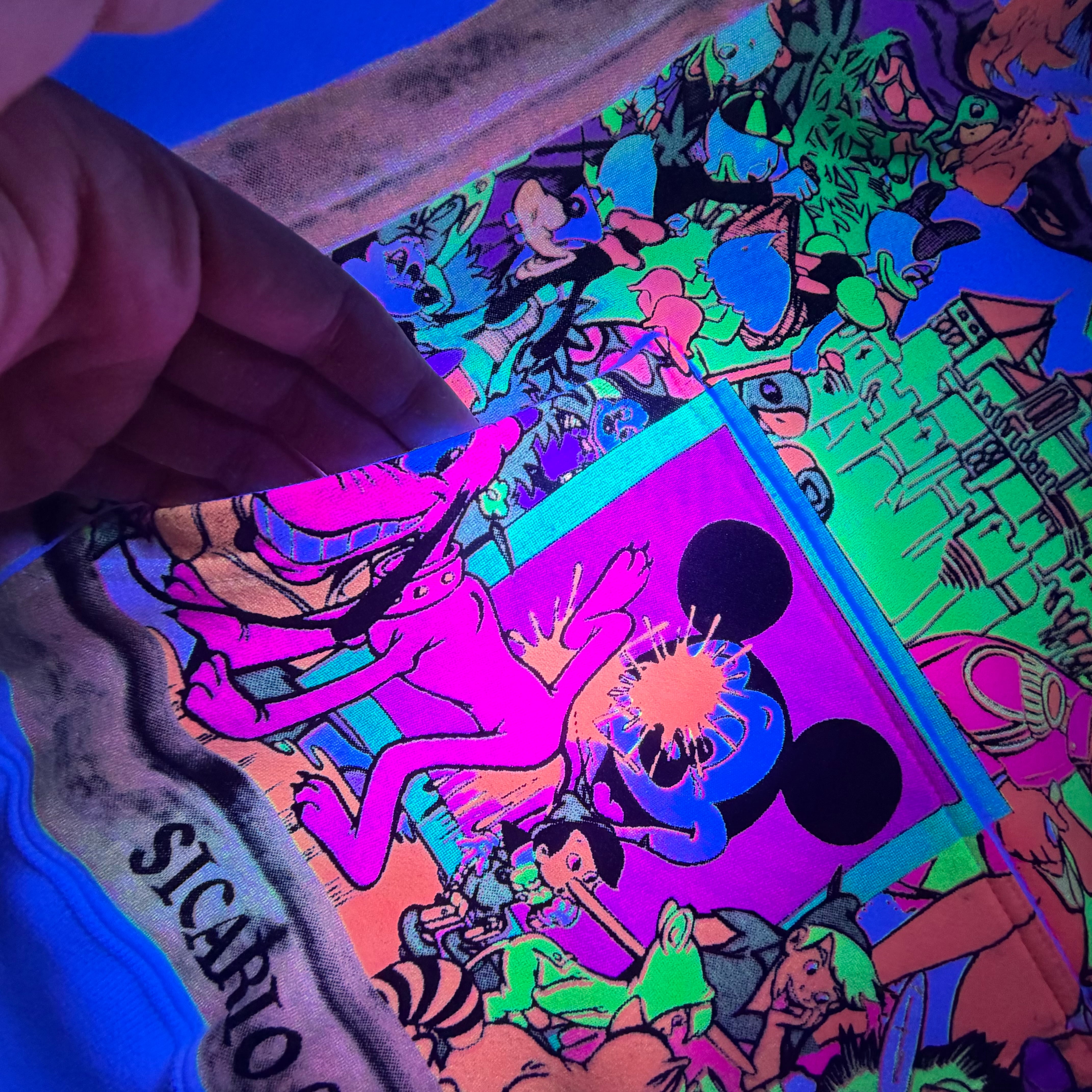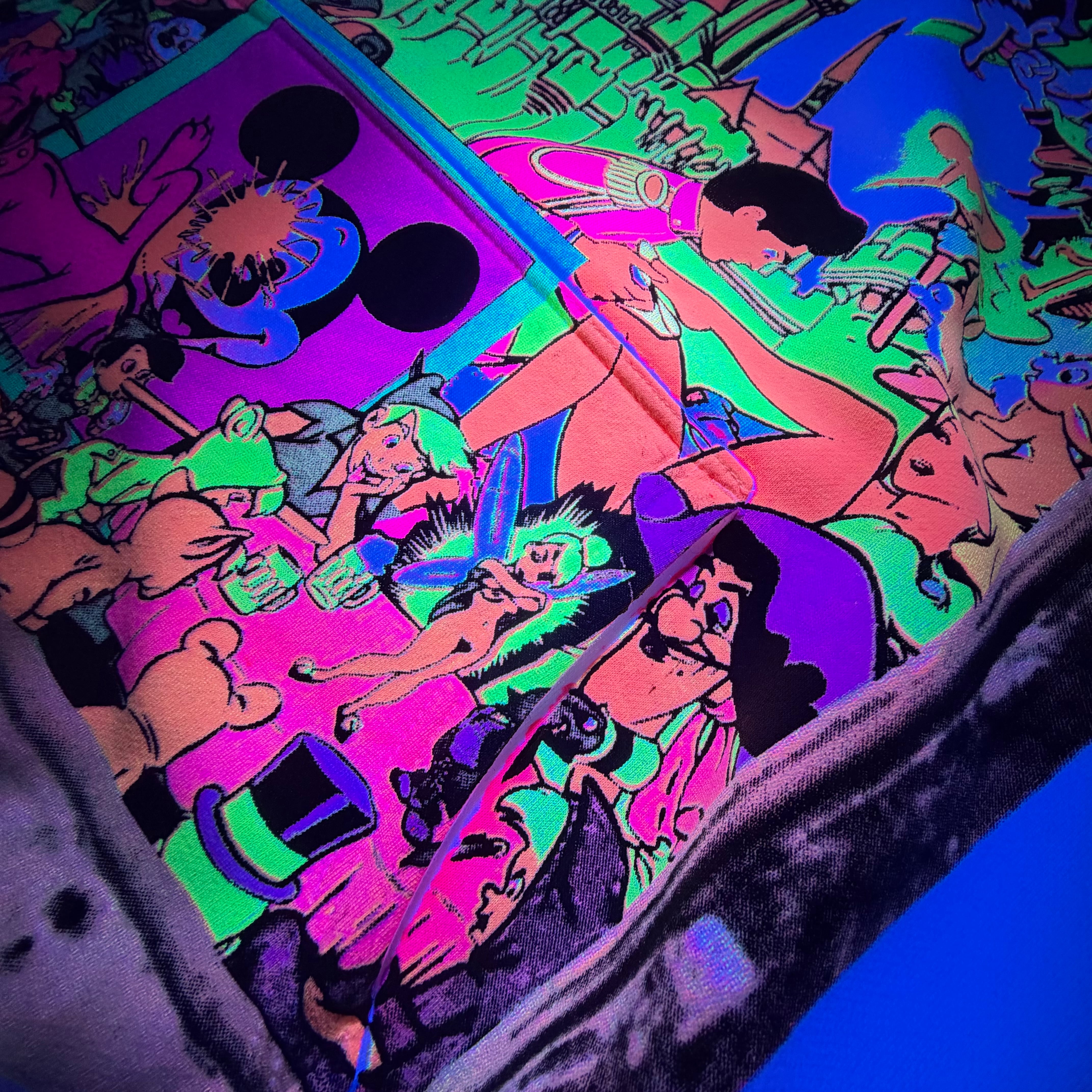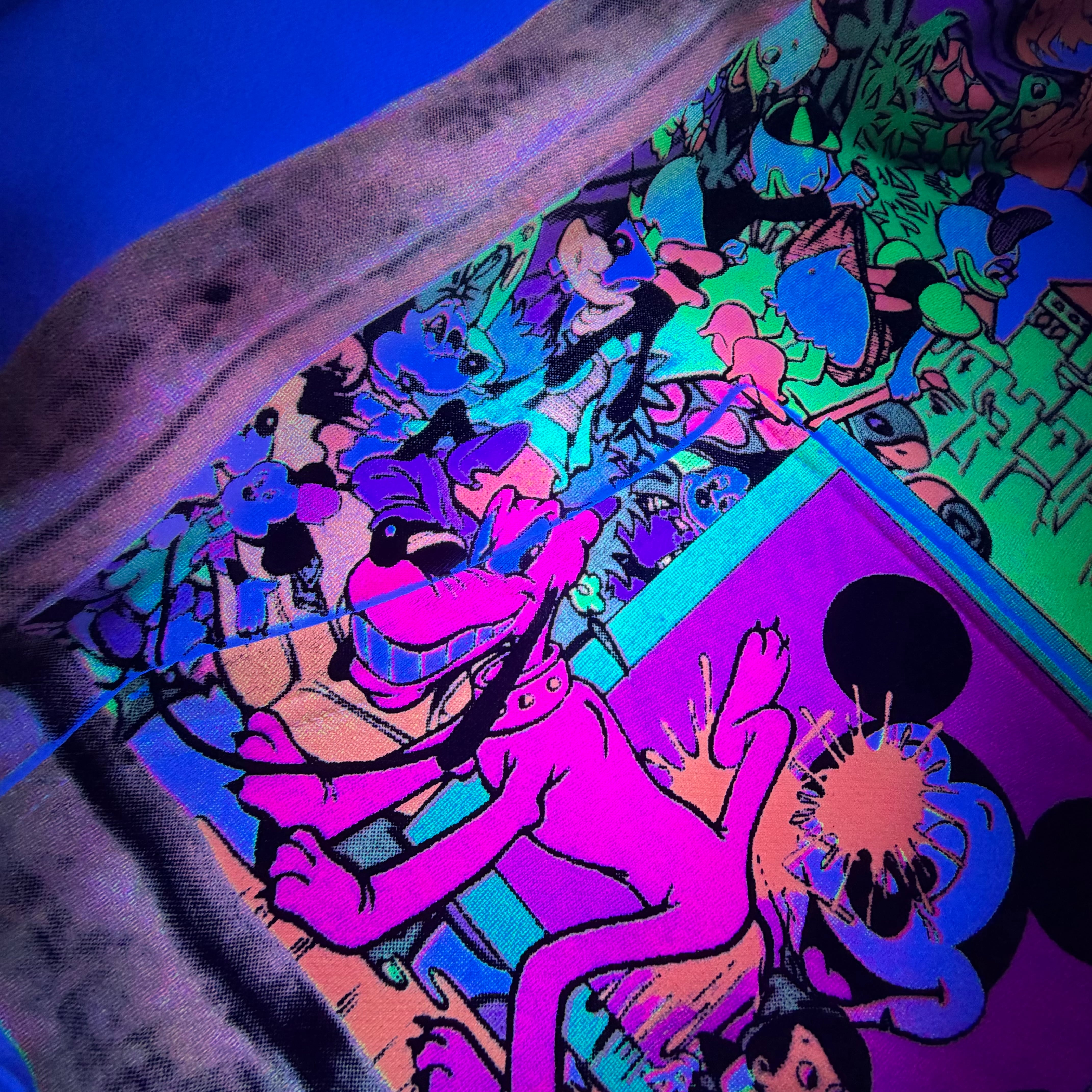 ブラックライトに反応する鮮烈なネオンカラーと退廃的なトーンのコントラスト。