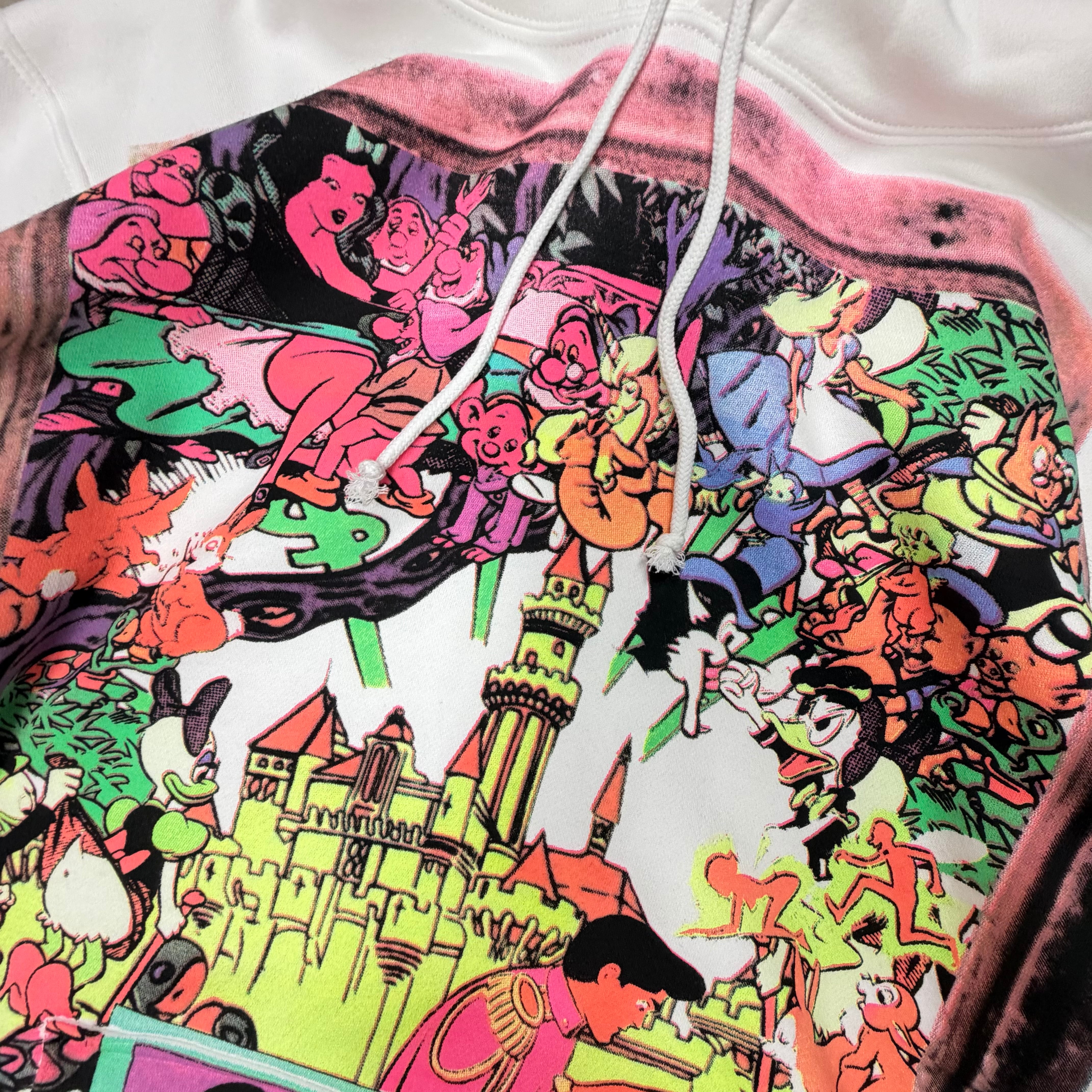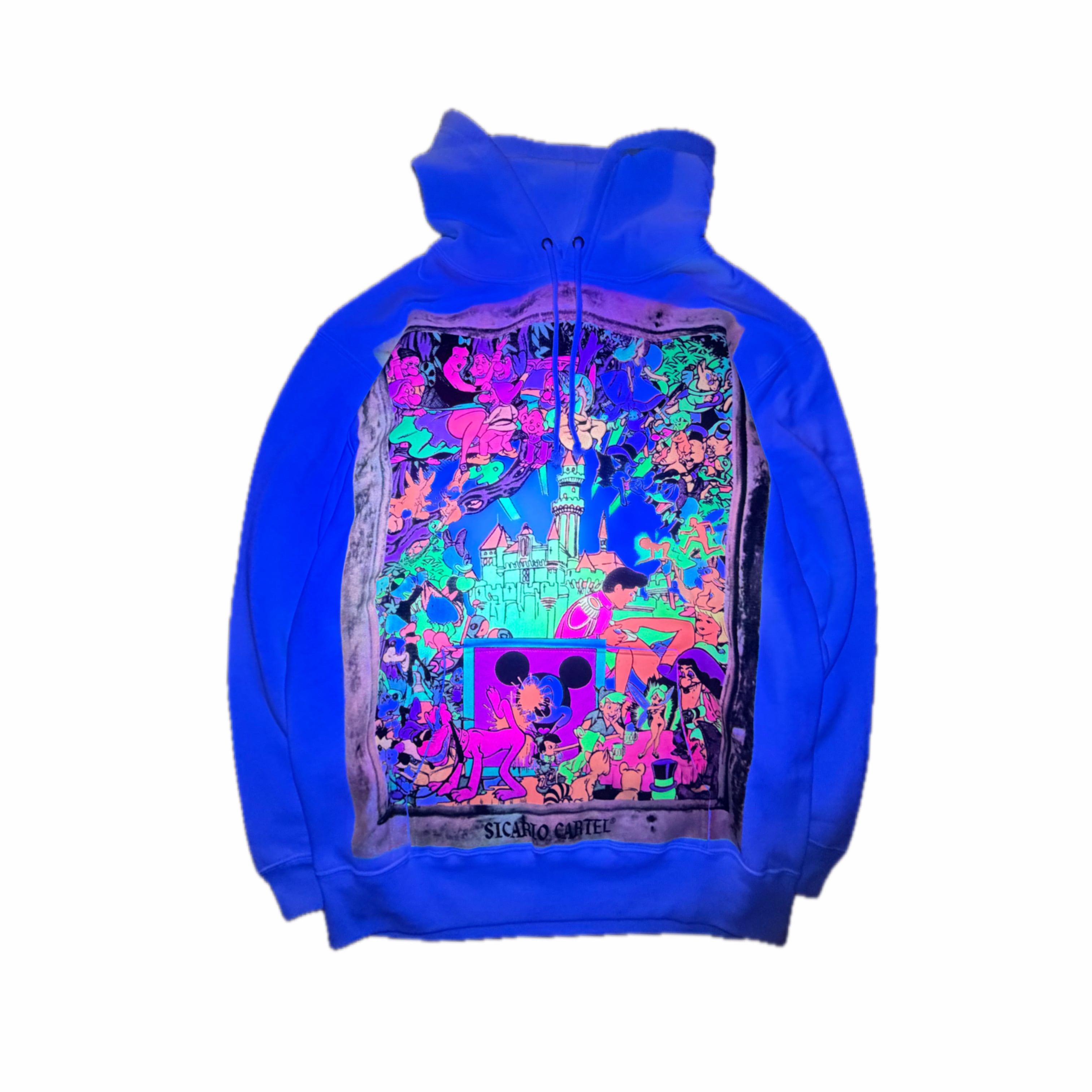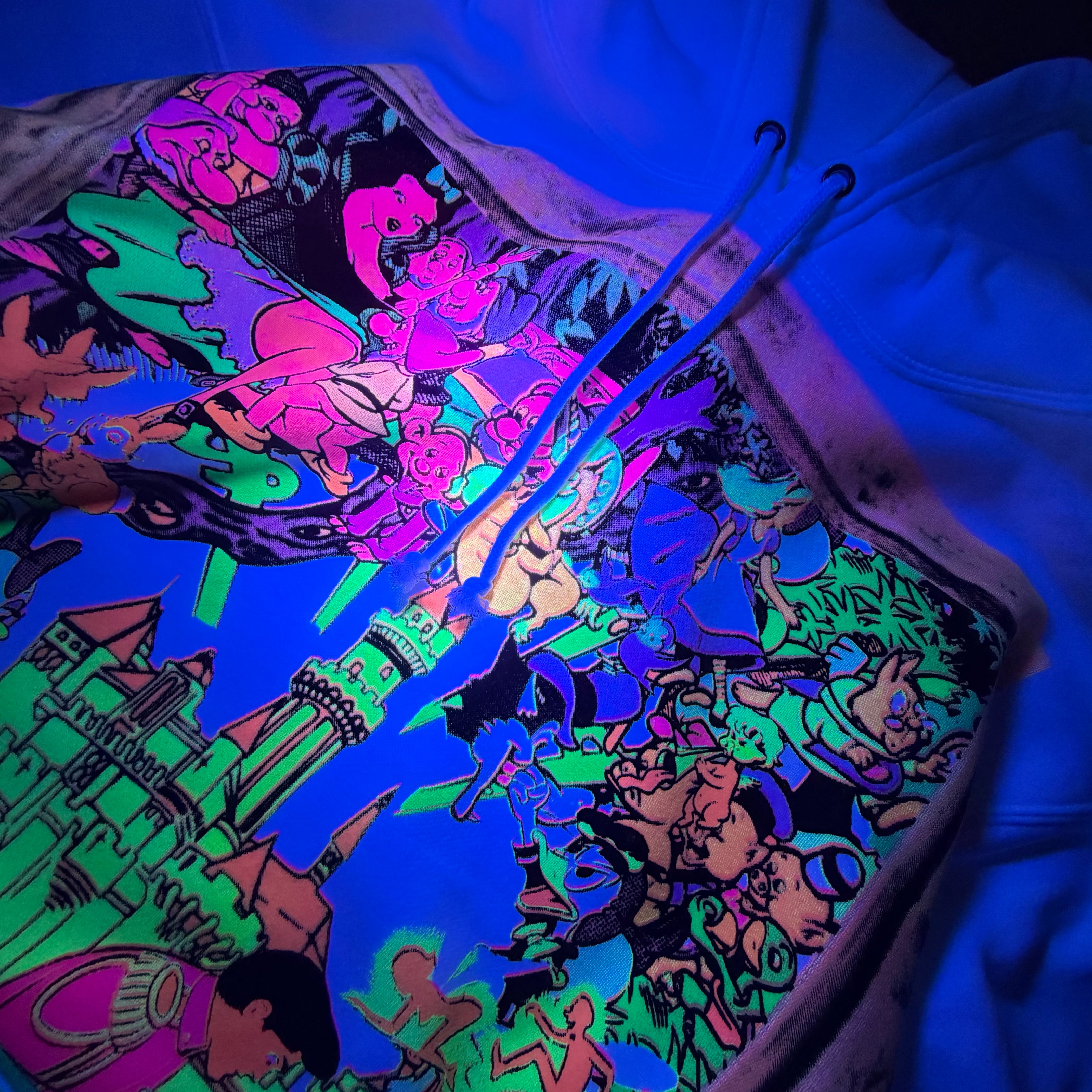 ブラックライトに反応する鮮烈なネオンカラーと退廃的なトーンのコントラスト。