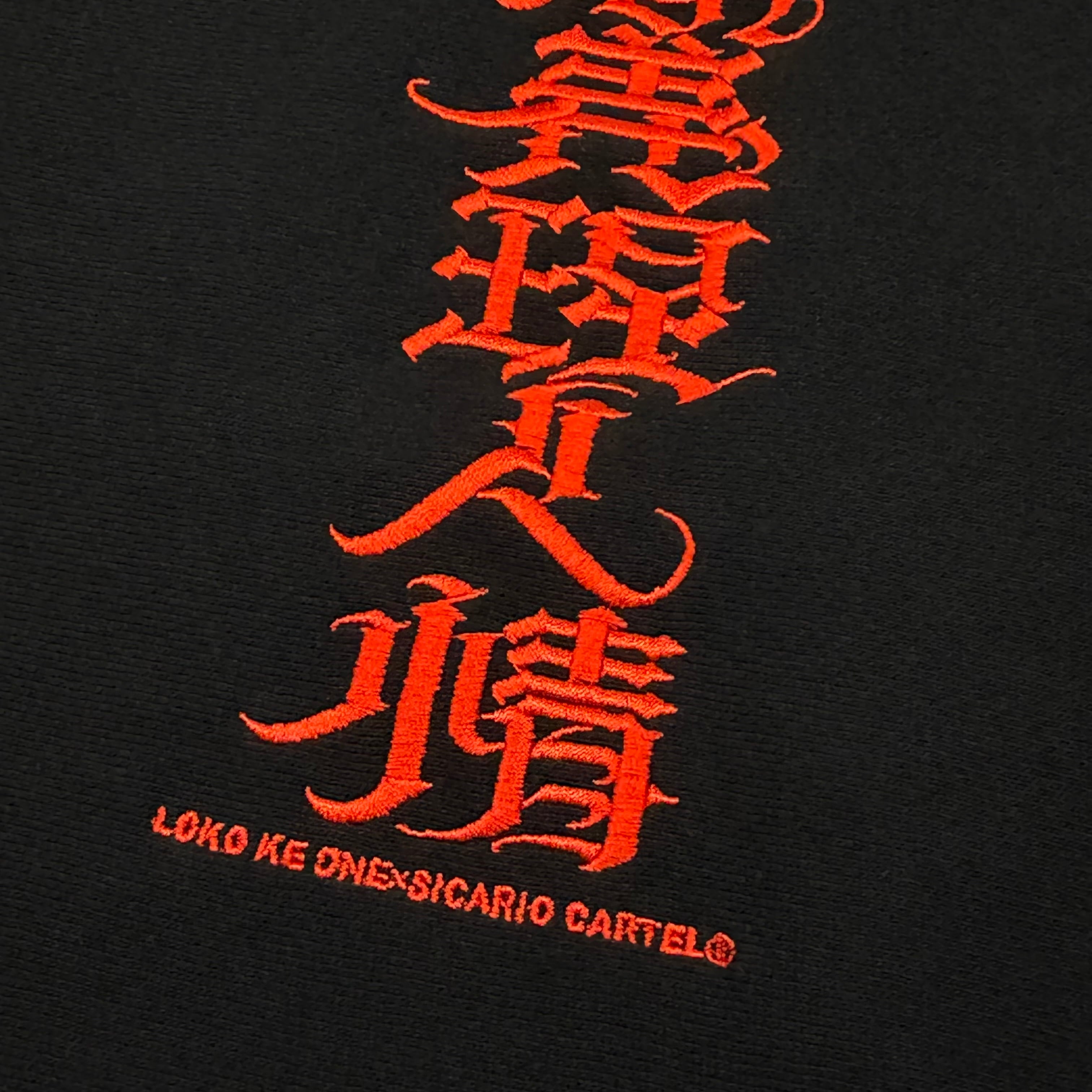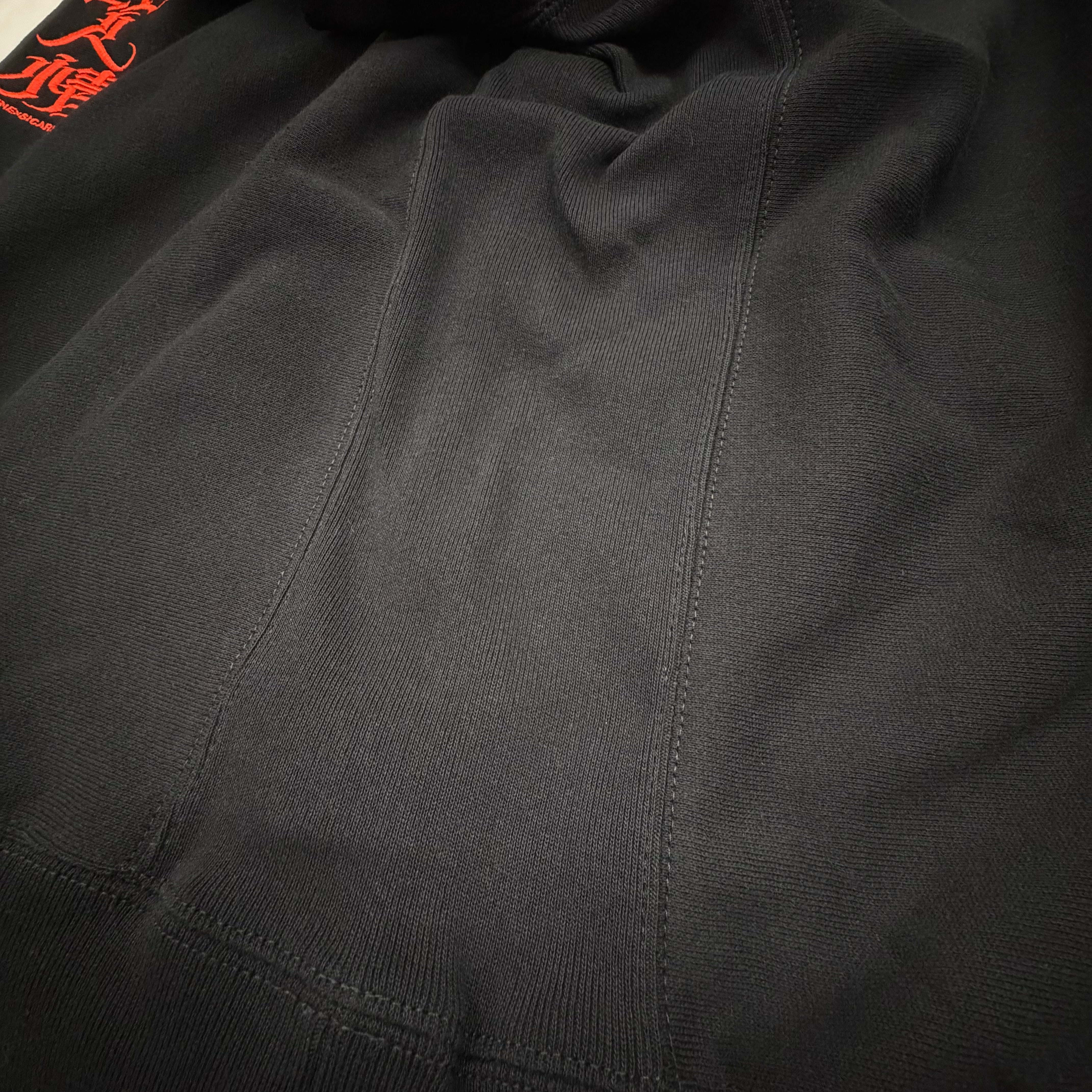 国内刺繍にて「家族仲間義理人情」LOKOKEONEデザインのクリミナルレタリングが入ります。12オンスの裏起毛スウェットを採用。リバースウィーブのような作りで厚手で大変丈夫です。長く愛用頂けるでしょう。